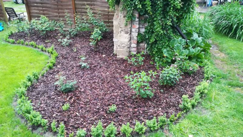 Wczoraj zdecydowałem się na wyściółkowanie nowej rabaty różanej korą. Wiem, że to dyskusyjne. Niestety obecnie rabata jest zbyt odsłonięta- nie ma jeszcze bylin uzupełniających. Pielenie jest koszmarem. Tak samo będzie z podlewaniem.
