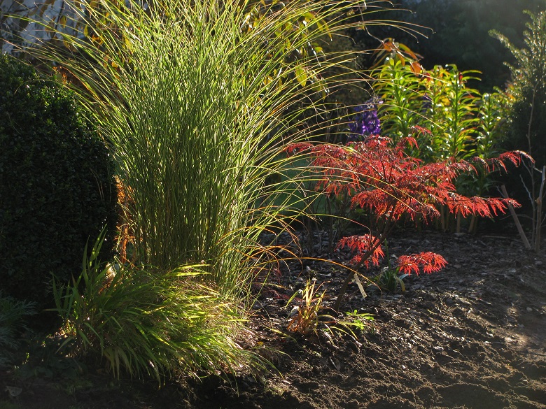 Z drugiej strony domu piękny złoty grujecznik na tle bukowego żywopłotu :
