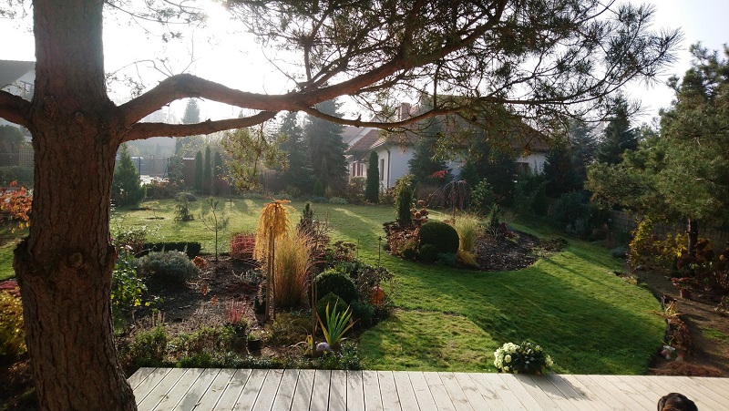 A tutaj już ujęcie z ostatniej jesieni , widać , że rośliny są większe i trawnik nie wydaje się taki rozległy.