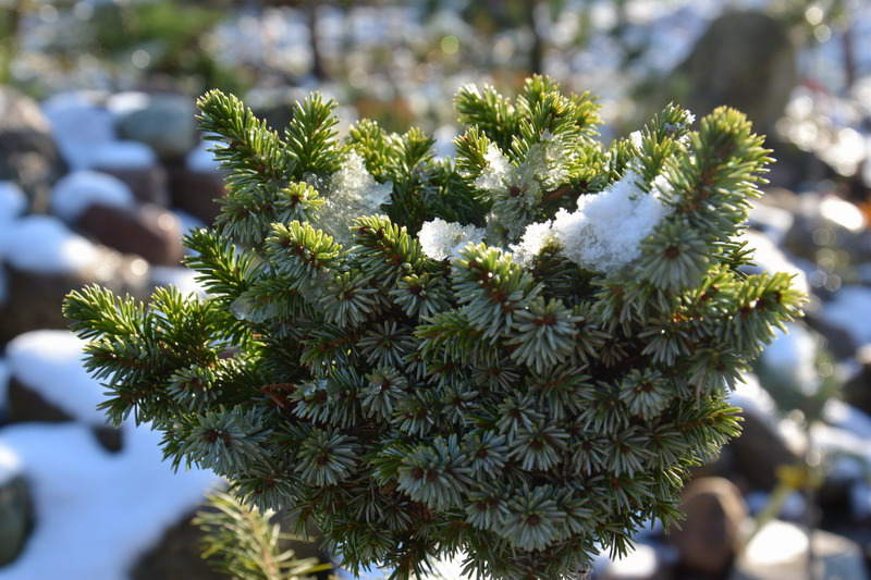 Jeśli chodzi o środki grzybobójcze, to nie ukrywam, że stosuję twardą chemię. Staram się dobierać środki w miarę nieszkodliwe dla środowiska (szczególnie dla pszczół), ale bez tego po prostu się nie da. Pryskam tak mniej więcej co miesiąc i to głównie te najmniejsze rośliny. Takie miniaturowe, zbite iglaki tworzą doskonałe środowisko dla grzybów i często jest tak, że gdy choroba stanie się widoczna gołym okiem, to na oprysk jest już za późno. Przy takiej ilości nie ma fizycznej możliwości regularnego dokładnego oglądania każdej z nich. Opryski zaczynam tak mniej więcej w połowie marca, gdy temperatura przekroczy na dobre +5 stopni.