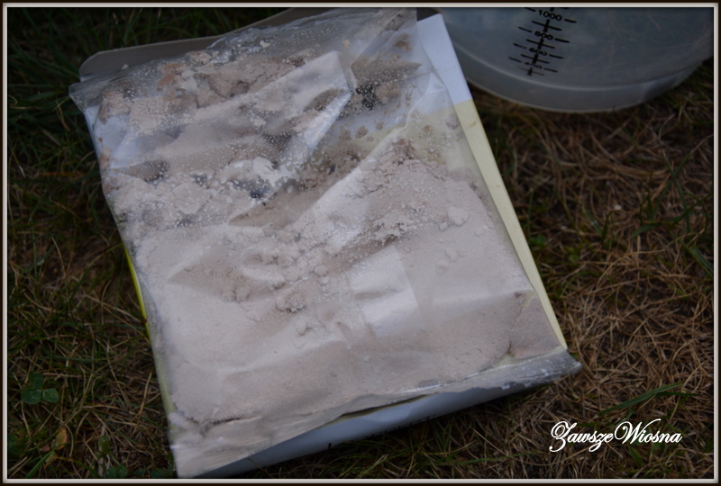 Proszek wsypujemy do wiaderka z wodą (w moim przypadku ok 10 litrów wody z deszczówki)