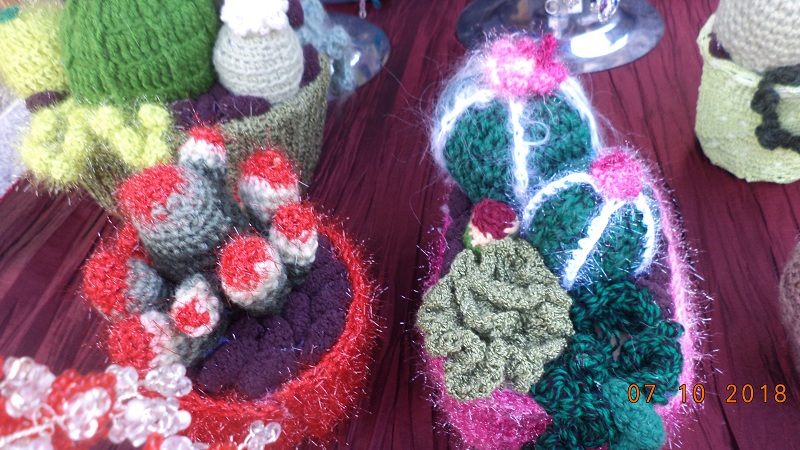 Włóczkowe kaktusy w doniczkach i koralikowe drzewka.
