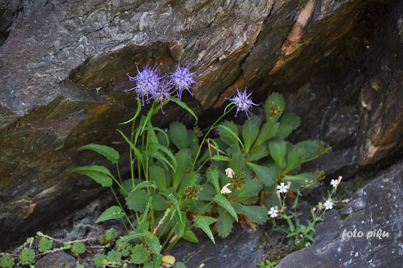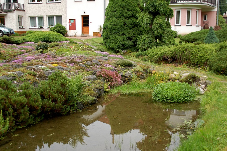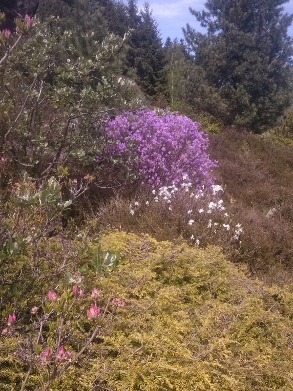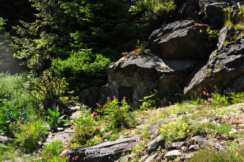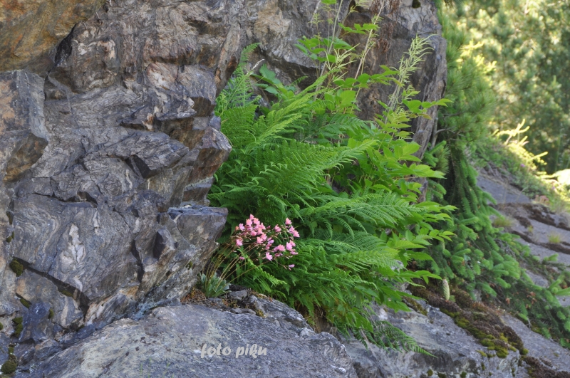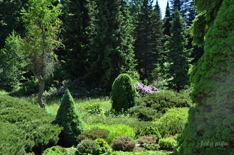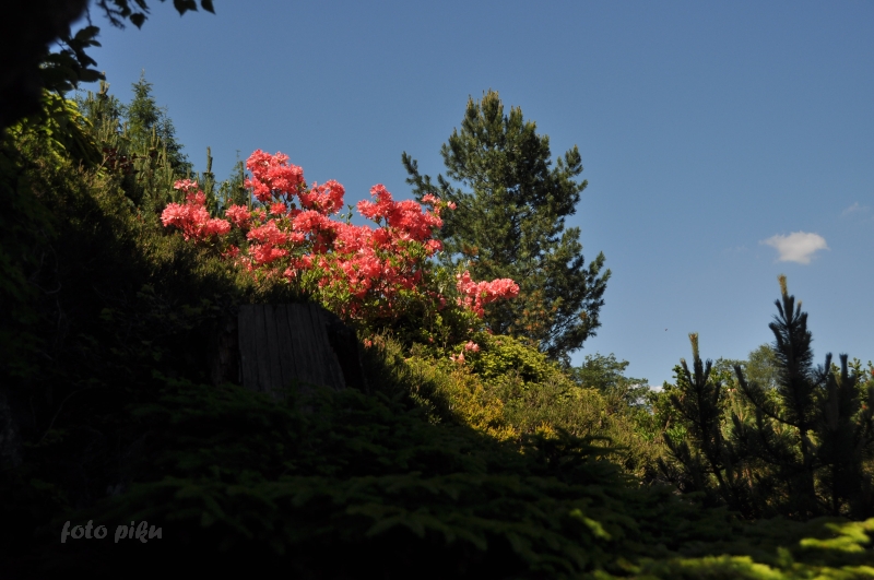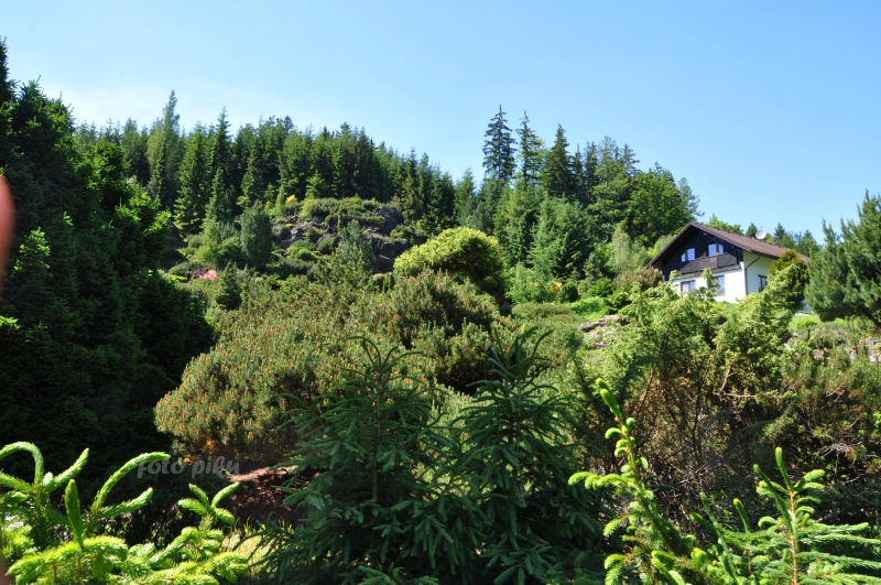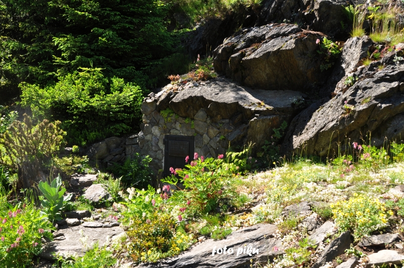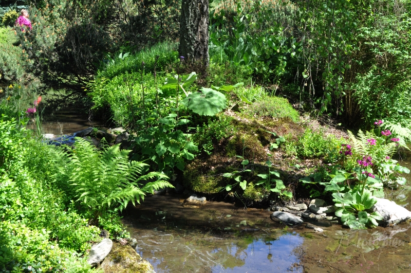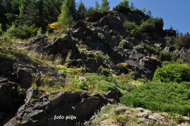 W sumie, relację zaczęłam od końca, bo wzniesiona część alpejska z ostrą skałą na szczycie , to korona tego ogrodu. Wcześniej jednak, idąc od domu pani Marii, mijamy część nadwodną, połozoną przy stawie i górskim potoku. Możemy tu podziwiać rośliny wodne, bagienne, ale i cienioluby . Nad potokiem zadziwia feeria barw kolorowych , płożących dywanów, utworzonych z roślin skalnych.