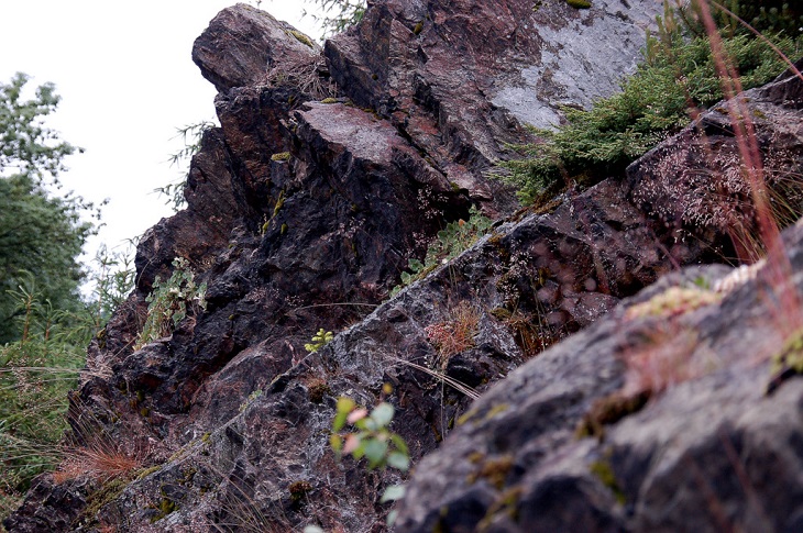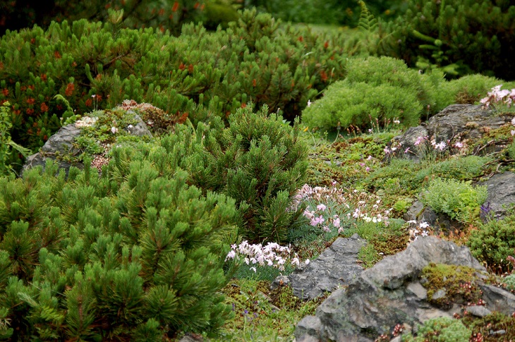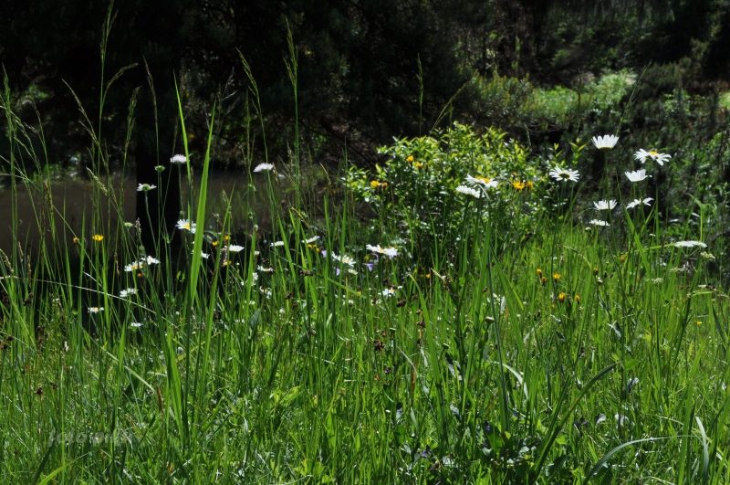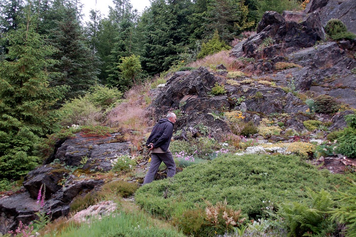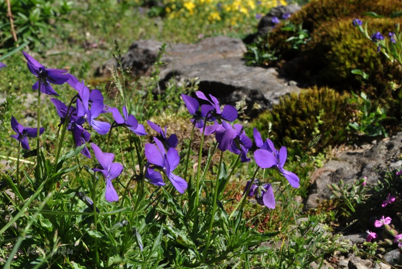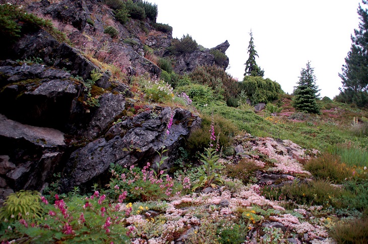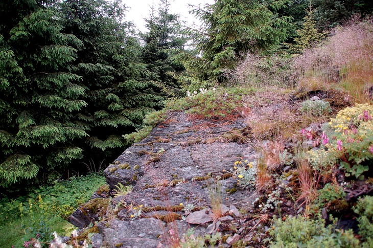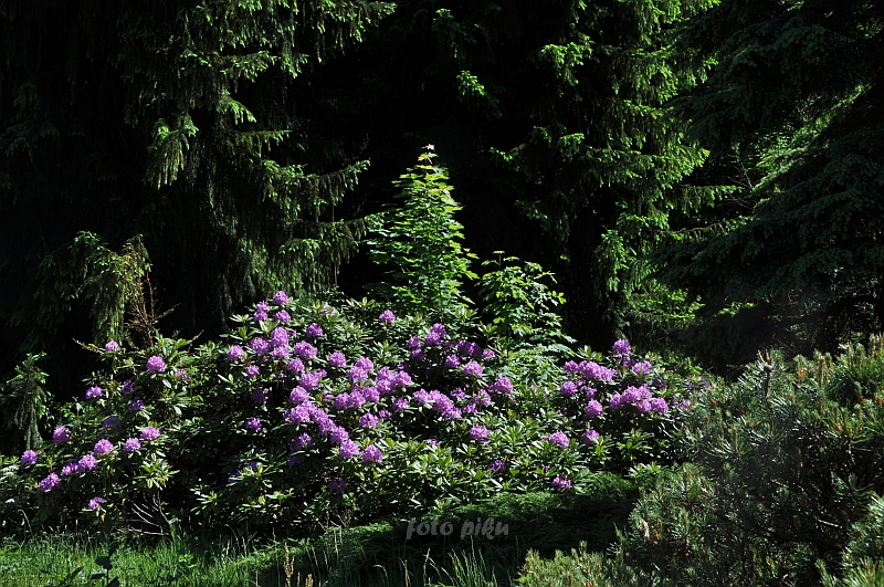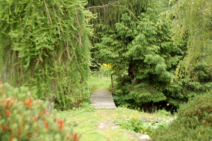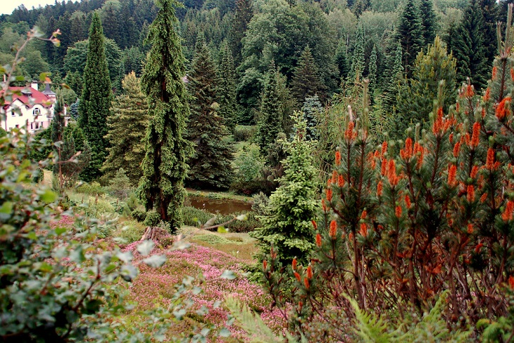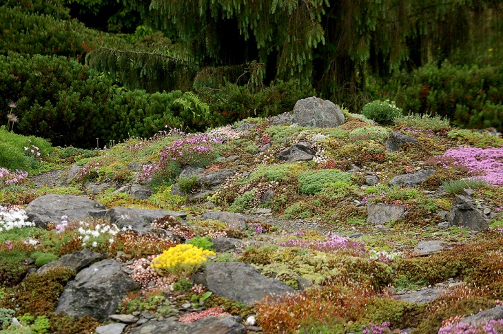 W sumie, relację zaczęłam od końca, bo wzniesiona część alpejska z ostrą skałą na szczycie , to korona tego ogrodu. Wcześniej jednak, idąc od domu pani Marii, mijamy część nadwodną, połozoną przy stawie i górskim potoku. Możemy tu podziwiać rośliny wodne, bagienne, ale i cienioluby . Nad potokiem zadziwia feeria barw kolorowych , płożących dywanów, utworzonych z roślin skalnych.
