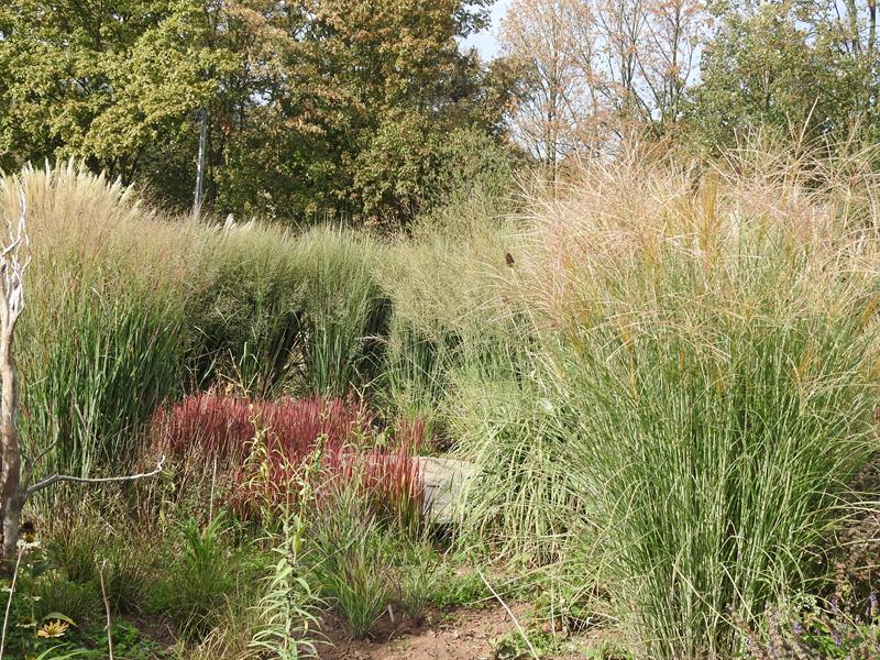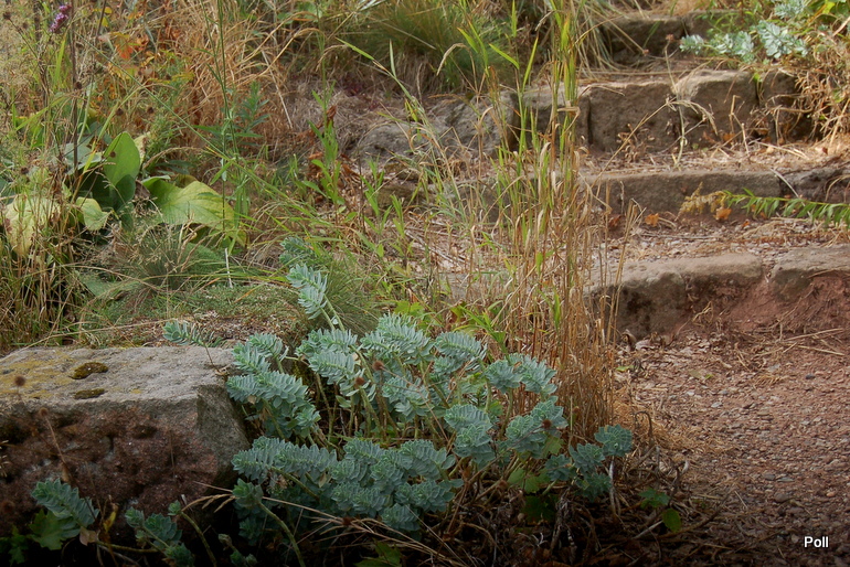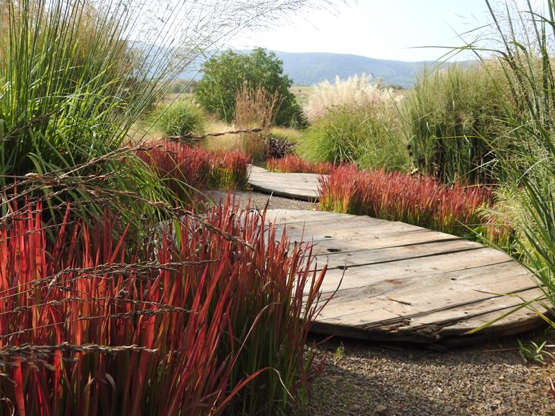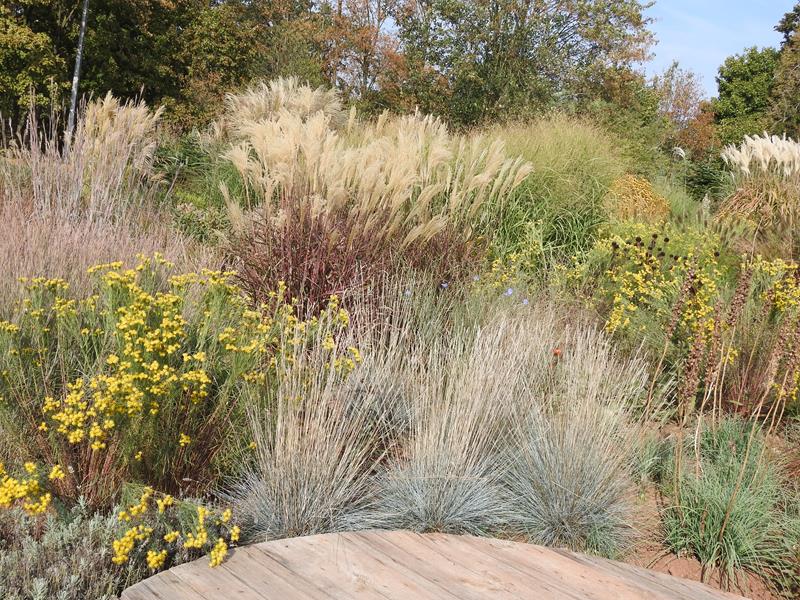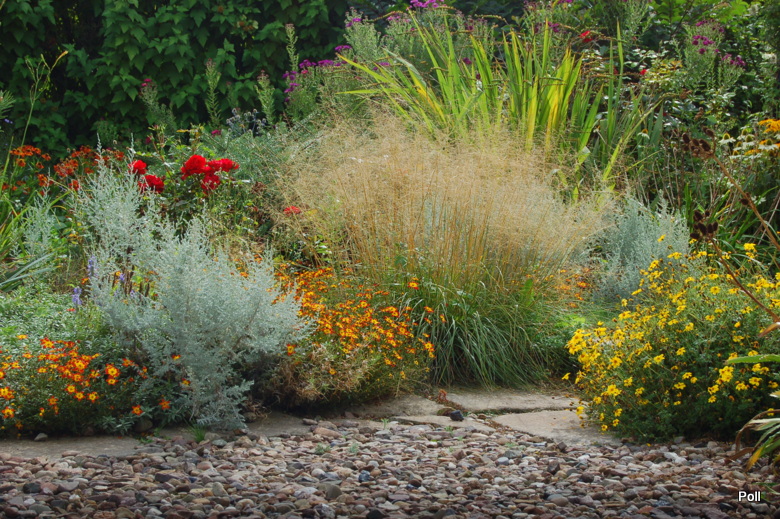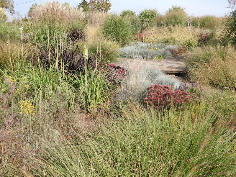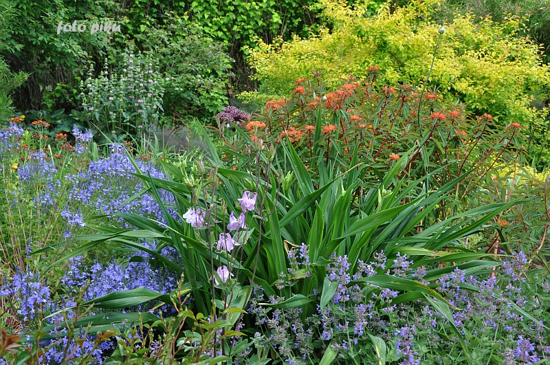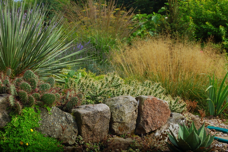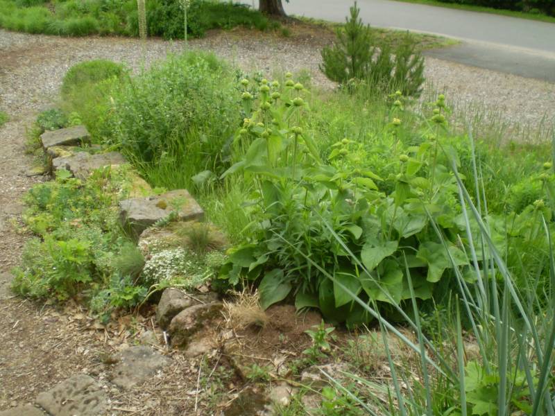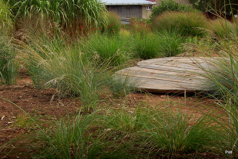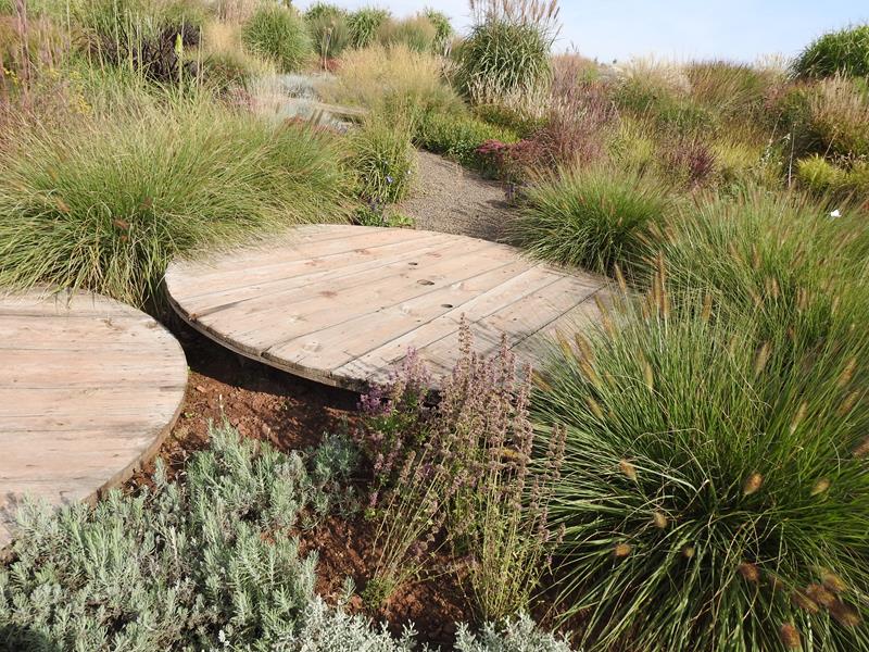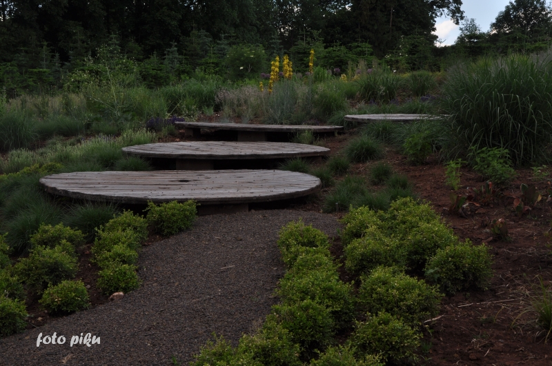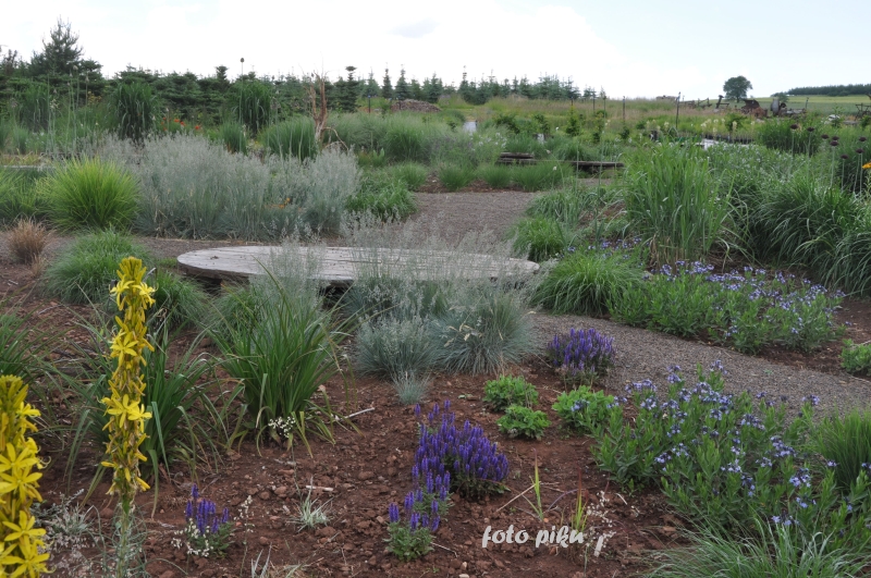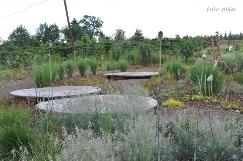 Ostatnio powstałym miejscem jest położona na słonecznym stoku rabata trawiasta, której nieco kosmicznego charakteru nadają podesty-ścieżki o kształcie koło. Był to kapitalny pomysł i gdy rośliny się rozrosną, będzie to jedna z najpiękniejszych rabat trawiastych, jakie widziałam. Wielkim plusem i ułatwieniem, jest brak konieczności skupienia się na ograniczonym terenie, bo miejsca jest jeszcze sporo , więc można to i owo dodać.