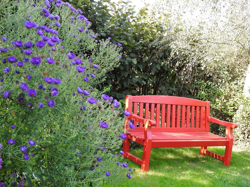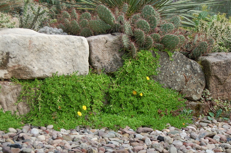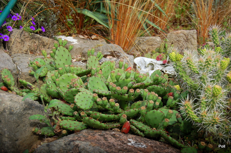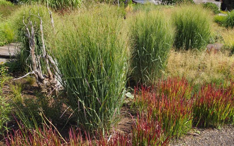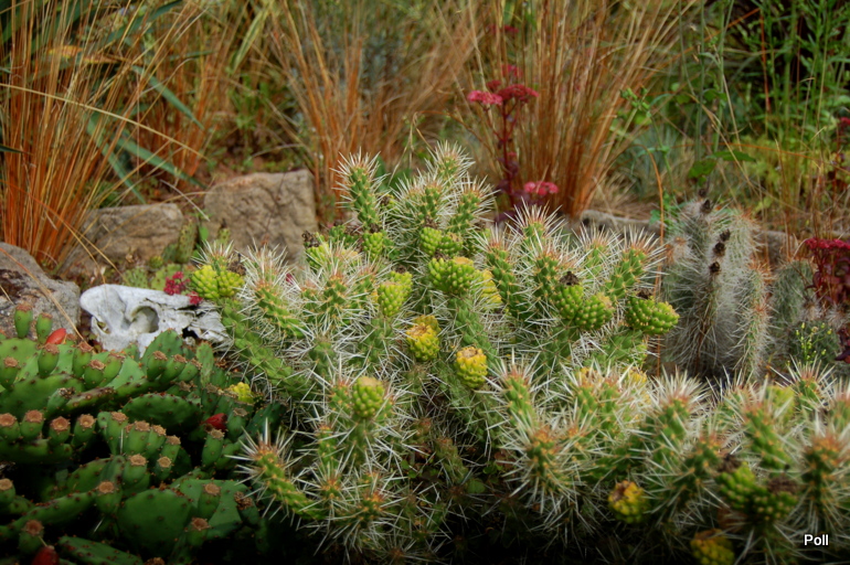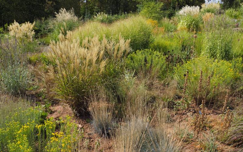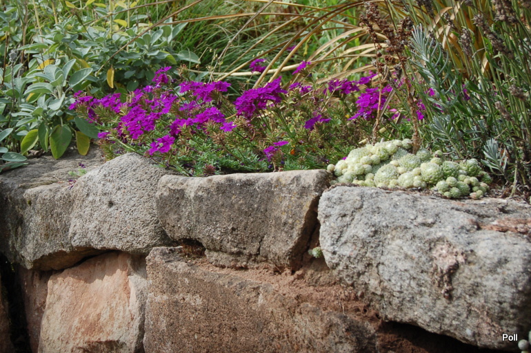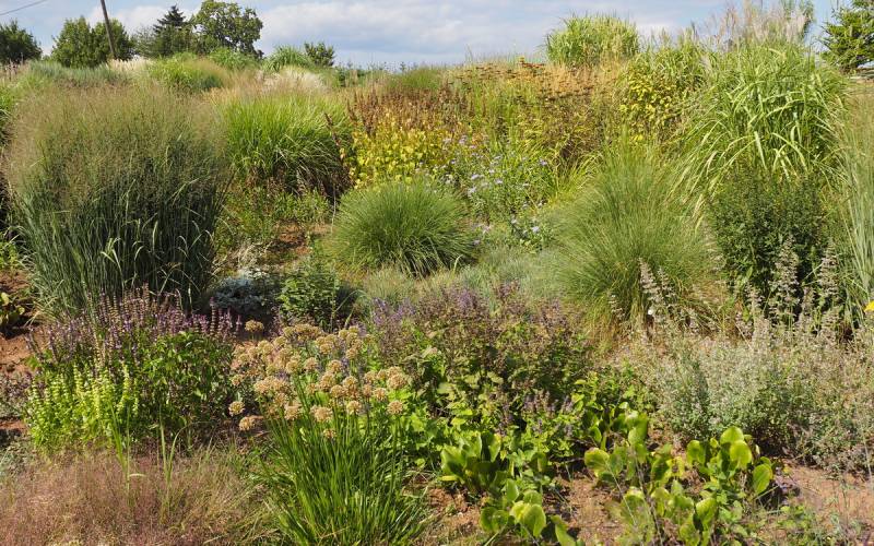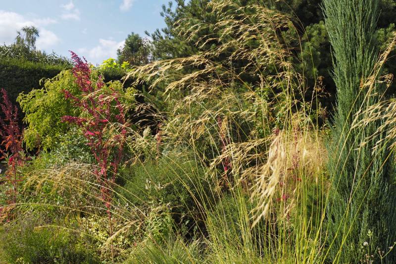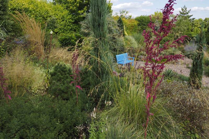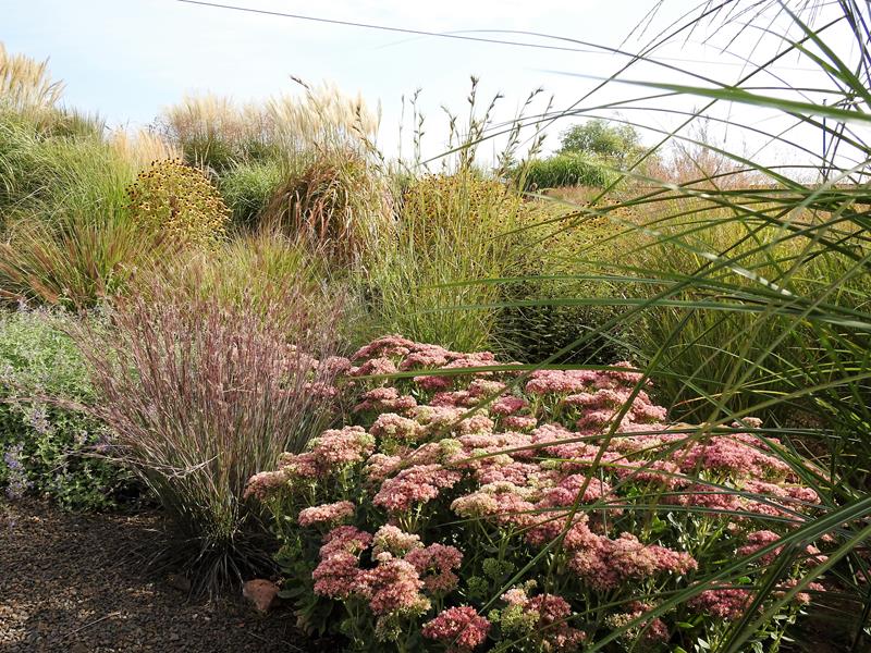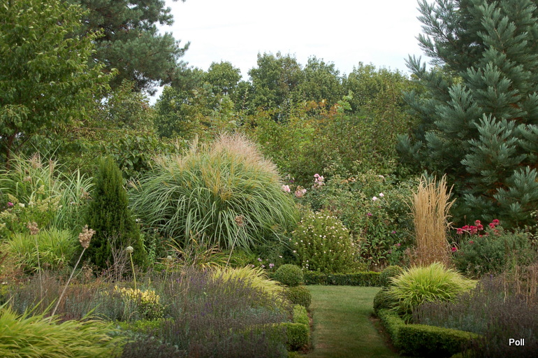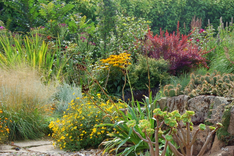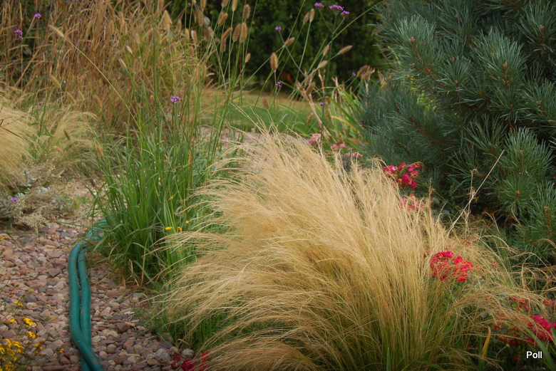 Ostatnio powstałym miejscem jest położona na słonecznym stoku rabata trawiasta, której nieco kosmicznego charakteru nadają podesty-ścieżki o kształcie koło. Był to kapitalny pomysł i gdy rośliny się rozrosną, będzie to jedna z najpiękniejszych rabat trawiastych, jakie widziałam. Wielkim plusem i ułatwieniem, jest brak konieczności skupienia się na ograniczonym terenie, bo miejsca jest jeszcze sporo , więc można to i owo dodać.