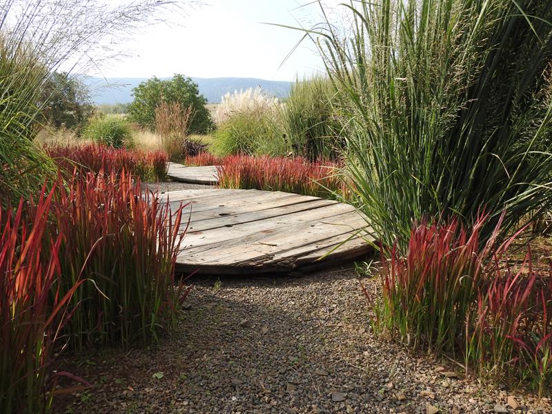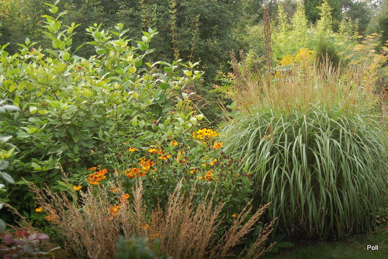 Posadzonych jest tu wiele gatunków mniejszych i większych traw ozdobnych, ale i jukki, rudbekie, jeżówki, dzielżany, perowskie, mikołajki, kłosowce ....a to wszystko poprzetykane krzewami - użyto do kompozycji m.in dających mocną kolorystyczną plamę, berberysów
