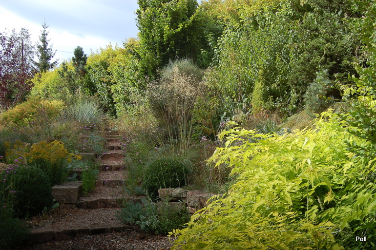 Cofając się, zejdziemy do zewnętrznej części ogrodu, która opada w dół, aż do drogi dojazdowej na posesję Grochowskich. Skorzystamy przy tym z kamiennych schodków obficie porośniętych sucholubnymi roślinami, które tu swobodnie sie rozrastają i wysiewają