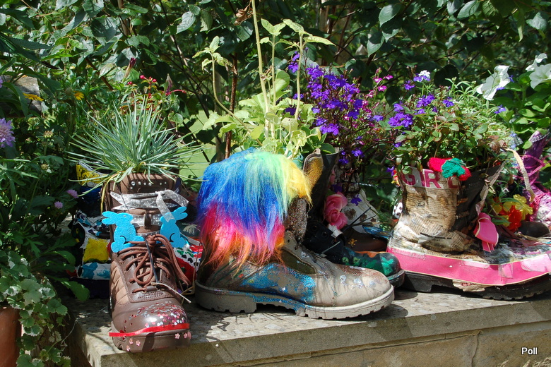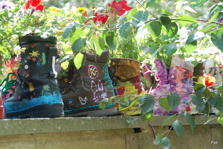 Ten problem jest coraz częściej podnoszony w prasie, czy telewizji. Bije się na alarm, ze Anglia staje się szarym, wybetonowanym krajem. Stąd sporo inicjatyw, m.in. RHS (Królewskie Towarzystwo Ogrodnicze), które mają ponownie obudzić ogrodniczego ducha w narodzie angielskim. Podczas mojej ostatniej wizyty w ogrodzie Harlow Carr ( zapewne i Olusi też ) , trwała akcja RHS pod tytułem 'Zazieleńmy szarą Brytanię'. Prowadzono pogadanki, wydano ulotki i plakaty, ale nie tylko... By zwrócić uwagę na problem w jakiś nietuzinkowy sposób, z pomocą 6 Regimentu Królewskiego Korpusu Logistycznego , który współpracuje z RHS CO w Yorkshire, zorganizowano dla uczniów tutejszych szkół 'Boot camp'.