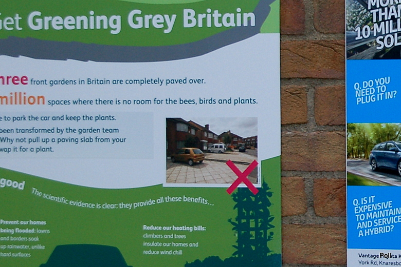 W innym miejscu przedstawiono przykład zagospodarowania przestrzeni przed domem, by godziła obie funkcje- miejsca parkingowego i minimalnego, ale jednak zielonego miejsca , namiastki przedogródka. Bijący na alarm plakat aż krzyczy, że przestrzenie przed domami stały się w Brytanii szare i wybetonowane...
