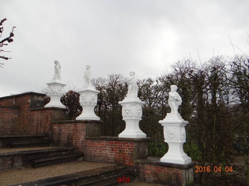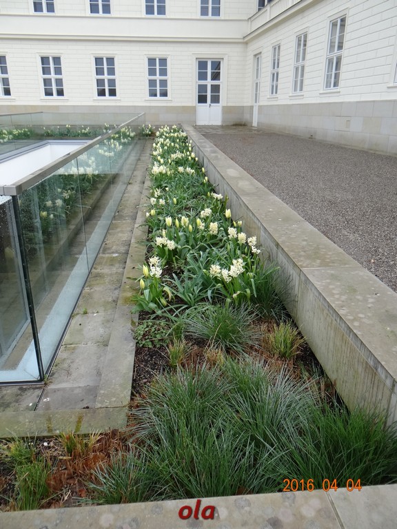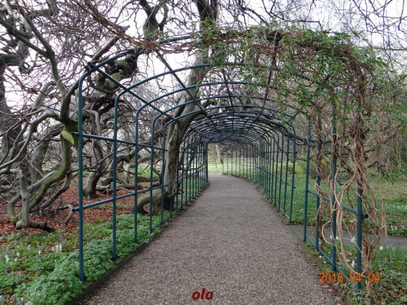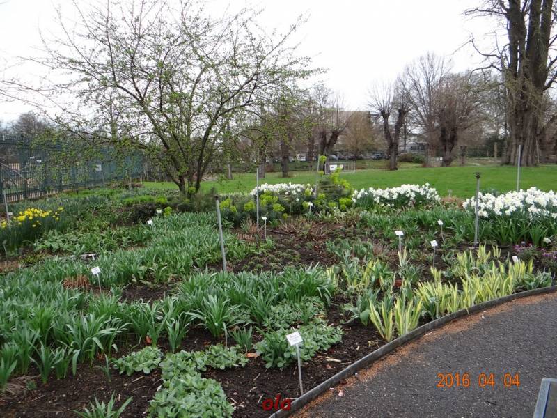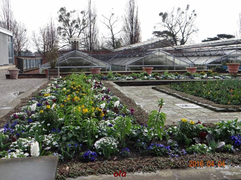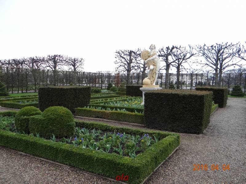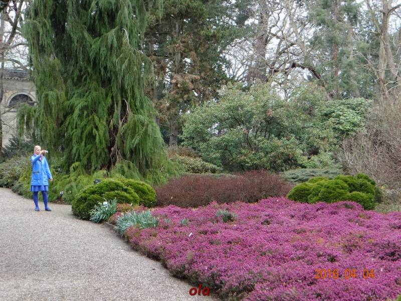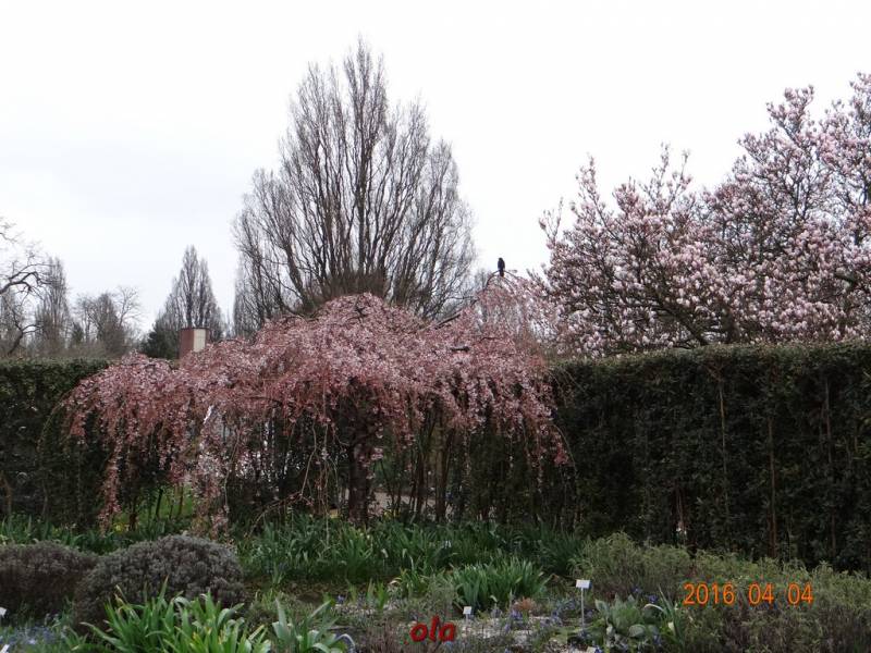 Ja zwiedzałam ten ogród na początku kwietnia. Drzewa jeszcze w stanie bezlistnym (nie mówię o tych zimozielonych żywopłotach) ale kwitły wiosenne cebulowe i bratki.