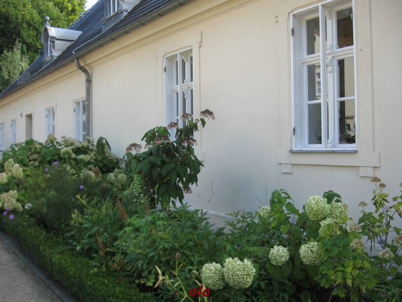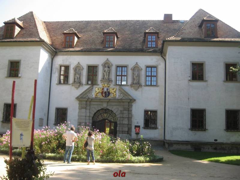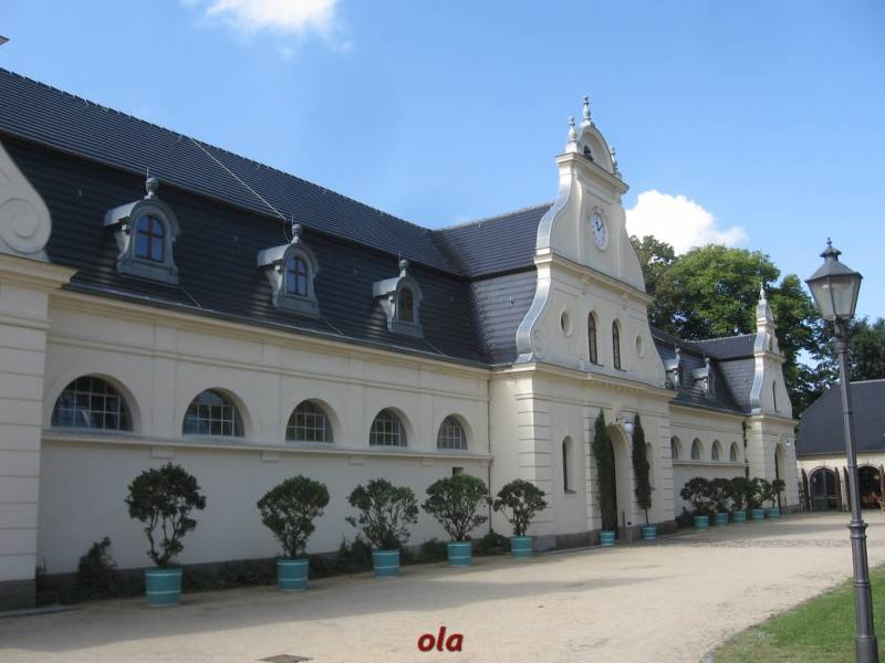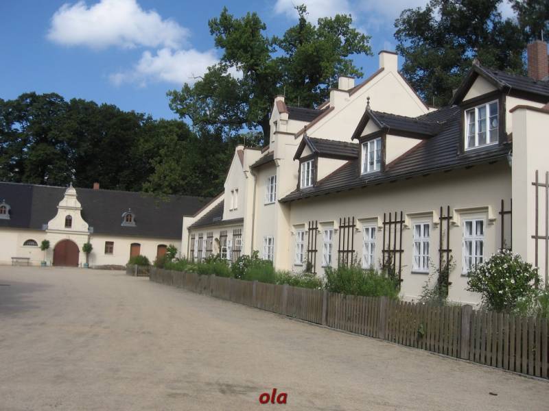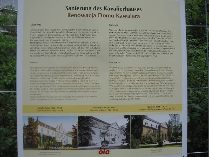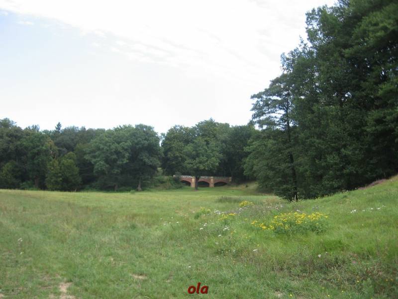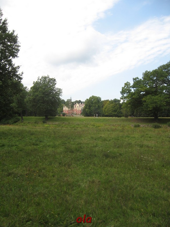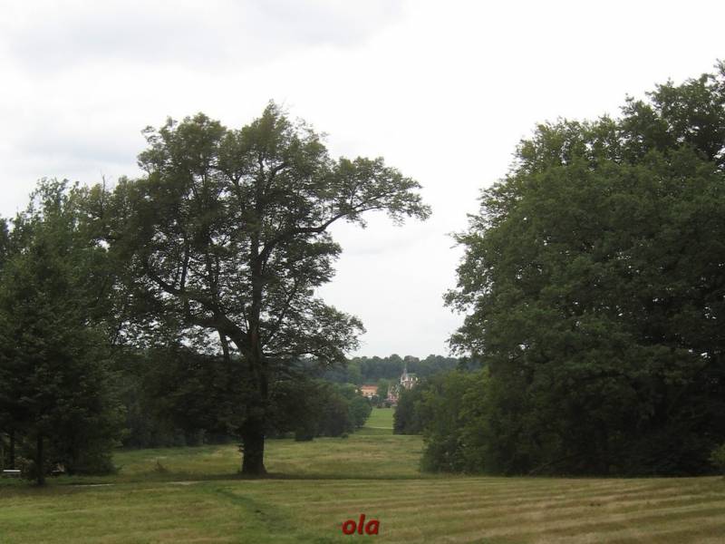 Pałac i ogrody przypałacowe są na terenie Niemiec a rozległe łąki i laski na polskim terenie .