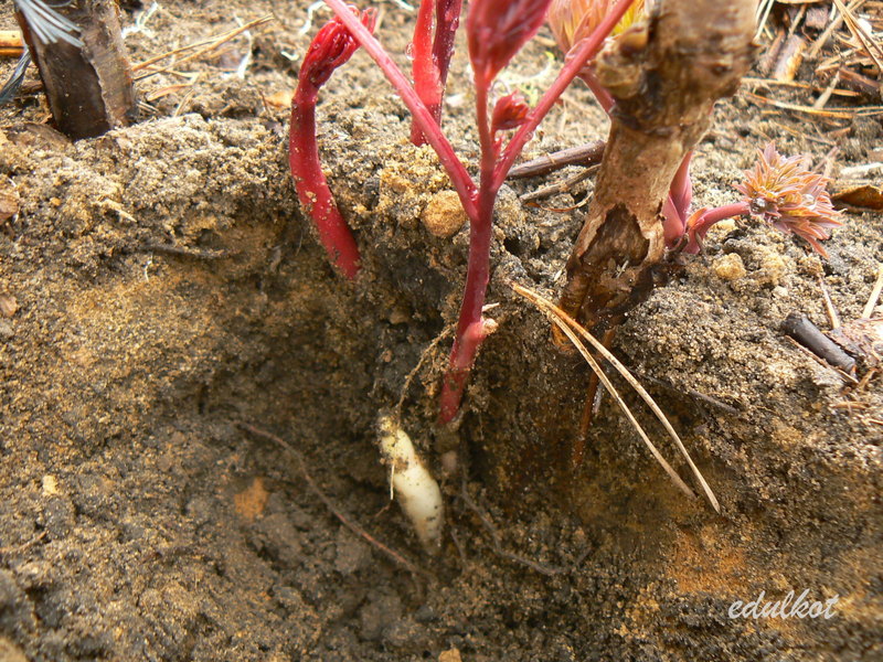 (pęd z drzewiastej zaszczepiony na bylinowej, korzenie peoni bylinowej, brak własnych korzeni peoni drzewiastej). Takie rośliny powinno się sadzić dość głęboko poniżej poziomu gruntu,