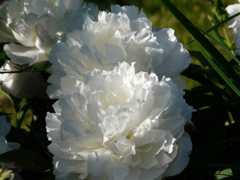 Kwiaty: do 20 cm, pełne, Kolor prawie biały może być z odcieniem kremowym lub różowawym (łososiowym). W miarę rozwijania się bieleje. Mogą wystąpić malinowe smugi. Pachnie.