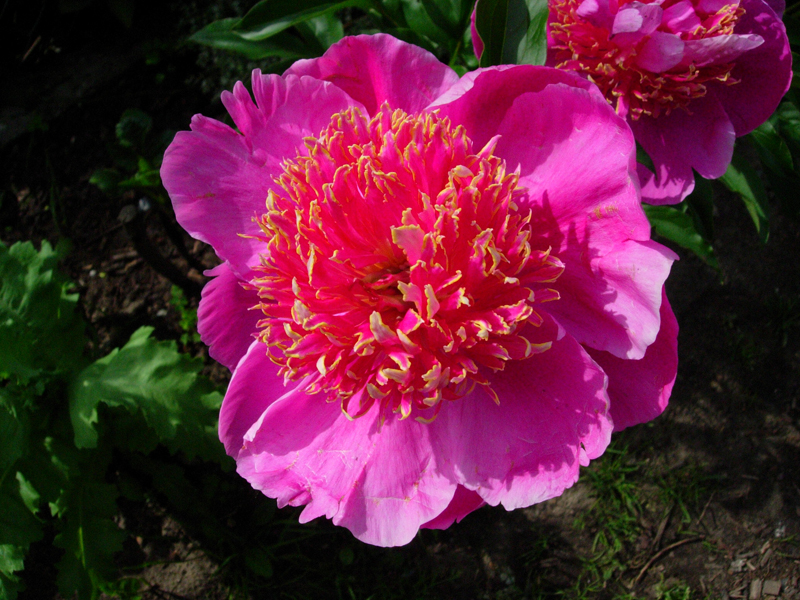 I jeszcze jedna peonia. Wydaje mi się, że taką samą ma Andrzej (post 1; fot. 6 i 7). Jest to też peonia wiśniowa, ale wręcz z odcieniem śliwkowym i charakterystycznym srebrzystym połyskiem. Pachnie, nie za mocno. Pędy bardzo silne - nie potrzebuje podpór. Trudno mówić o terminie kwitnienia, bo w tym roku to co kwitło przez miesiąc, przez upały trwało tylko 2 tygodnie. U mnie zakwitła pierwszy raz - od razu 5. kwiatami. Bardzo charakterystyczna jest gruba, gęsta "korona" złotych pręcików w środku i składa płatki w bardzo charakterystyczny, uporządkowany sposób. Swego czasu podejrzane były Karl Rosenfield lub Etienne Mechin. Proszę o sugestie pukpuk .