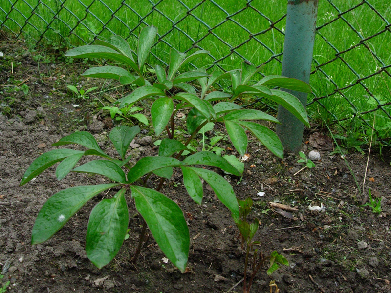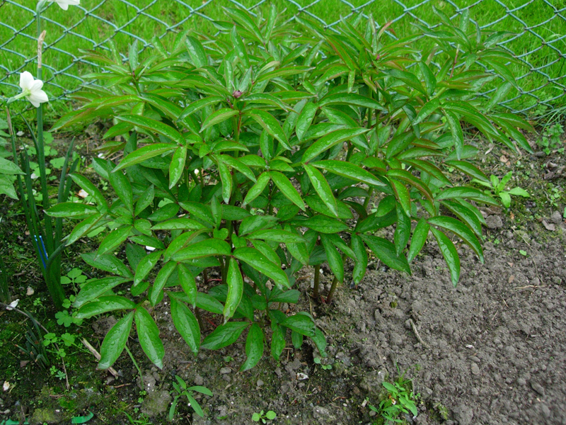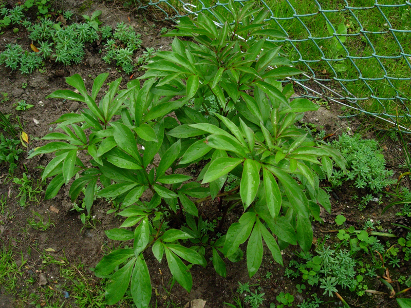 W przyszłym sezonie liczę na piękne kwiaty. Tutaj widać liście czyste, bez śladu szarej pleśni. Ta peonia była wcześniej tak bardzo porażona szarą pleśnią, że o tej porze jej liście były już bordowe. Przy przesadzaniu odcinałam zagrzybione kłącza i paliłam. Czasami wsadzałam tylko oczko z kawałkiem korzonka. Wszystko wymoczone w Kaptanie lub Dithane. Jak widać na zdjęciu operacja się chyba opłacała tylko niestety na kwiaty trzeba będzie poczekać jeszcze rok.