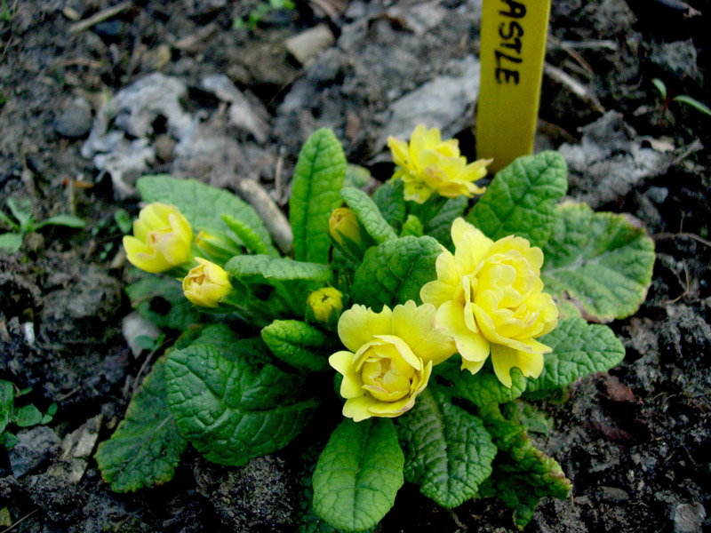 Pierwiosnek „Val Horncastle” lub (coraz bardziej się ku temu skłaniam) „Sunshine Suzie” – wskaźniki powyciągane i wymieszane. Kiedy zakwitnie ten, przy którym zatknęłam drugi wskaźnik będę wiedzieć na pewno, bo oba przywędrowały do mnie w tamtym roku i to jest ich pierwsze kwitnienie.