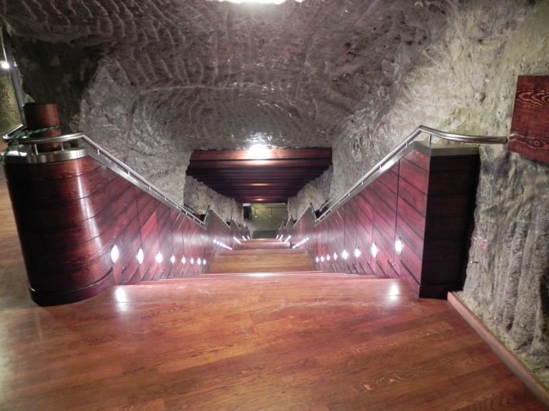 Zaczynamy zwiedzanie schodząc w dół po schodach. Można dostać zawrotu głowy krecigl Schodzimy na I poziom, krętą "klatką schodową", na głębokość 64 metrów