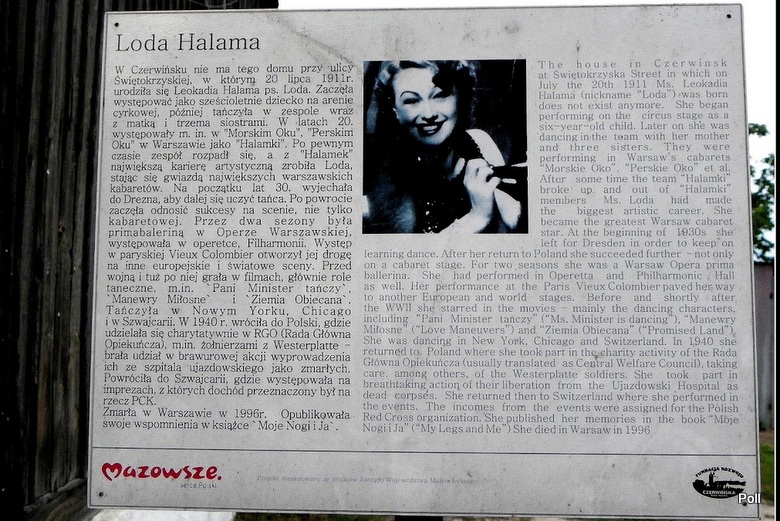 Okazało sie, że w miejscu, gdzie umieszczono tablicę, stał rodzinny dom Leokadii Halamy, znanej pod pseudonimem Loda Halama, polskiej przedwojennej artystki rewiowej, filmowej i baletnicy. Urodziła się 20 lipca 1911 r,jako córka tancerki Marty Cegielskiej i muzyka, Stanisława Halamy. W popularnym programie 'Stare kino', mogliśmy obejrzeć większość filmów z jej udziałem m.in "Kłamstwo Krystyny" z 1939 r