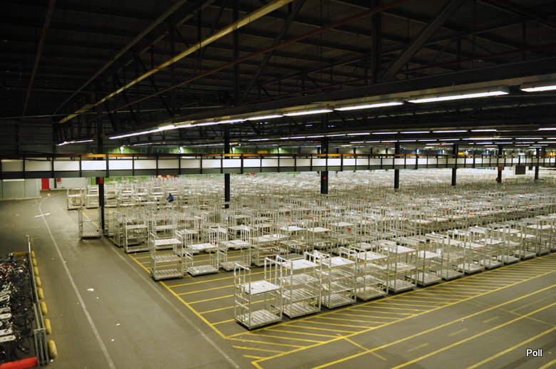 Teren giełdy udostępniony został do zwiedzania ale odbywa sie ono z prowadzacego na piętrze odkrytego korytarza, aby nie zakłócać pracy. Na początek przechodzimy więc nad halami magazynowymi, gdzie składowane sa chwilowo niepotrzebne wozki. Sama powierzchnia hali i ilośc wózków daja do myslenia...Przecież to tylko chwilowo puste pojazdy...