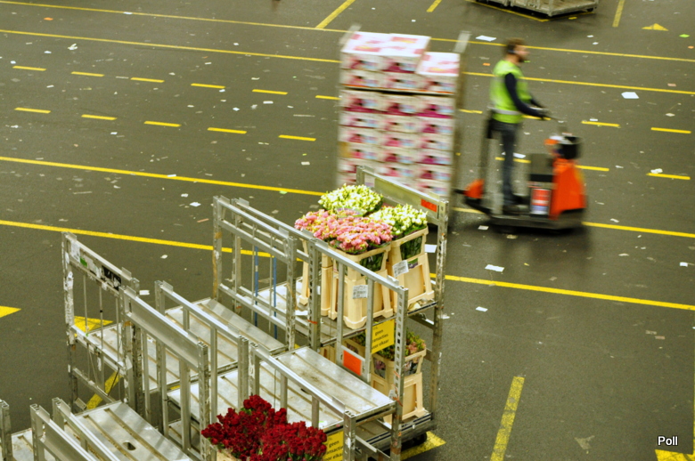 Zamówienia hurtowników przekazywane sa do hali na dole, gdzie pracownicy na wózkach gromadzą je i szykują do pakowania. To własnie miejsce najbardziej mnie zadziwiło. Setki wózków i praconików z słuchawkami na uszach precyzyjnie pobierają z miejsc magazynowania i dostarczaja na miejsce całe, długie sznury wózków wypełnionych kwiatami i zywymi dodatkami florystycznymi.