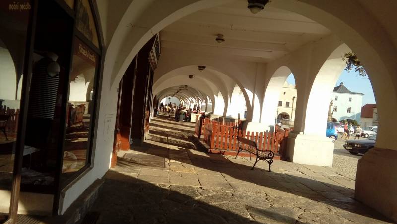 Jesteśmy na rynku.Dookoła kamienice z takimi podcieniami.Na sufice tych podcieni jest pełno jaskólczych gniazd.