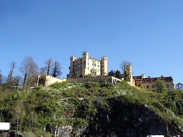 Bilety do obu zamków kupujemy w miasteczku- koszt 12-15 euro. Do Zamku Hohenschwangau wspinamy się około 10 minut po sporej ilości schodów. Do zamku króla Ludwika II idziemy pod górę asfaltem około 40 minut do 1 godziny. Można do tego zamku wjechać też bryczką, koszt 6 euro pod górę i 3 euro w dół. Każdy przejazd jest automatycznie kontrolowany i rejestrowany przez system i żaden z powozów nie ma prawa wykonać więcej kursów niż jest to przewidziane dla koników, w dodatku w bryczce jest miejsce dla około 9 osób, a nie kilkunastu jak nad nieszczęsnym Morskim Okiem. Zauważyliśmy, że powożący ma specjalny hamulec, który w drodze na dół pozwala na odciążenie koników. Generalnie jestem zdania, że jak nie jesteś w stanie gdzieś wejść to się tam nie pchaj, a z koników niech korzystają osoby schorowane lub rodzice z dziećmi. W naszej grupie była np. starsza pani w wieku 70 lat poruszająca się o lasce i wszędzie szła na swoich nogach, po drodze na zamek położony wyżej, zabrały ją służby porządkowe, w samym zaś zamku w wielkiej sali tronowej gdzie dość długo staliśmy, natychmiast pan ze straży zamkowej rozłożył jej wygodne krzesło.