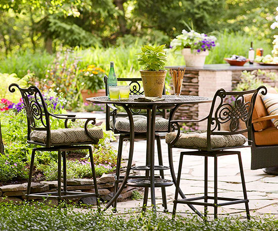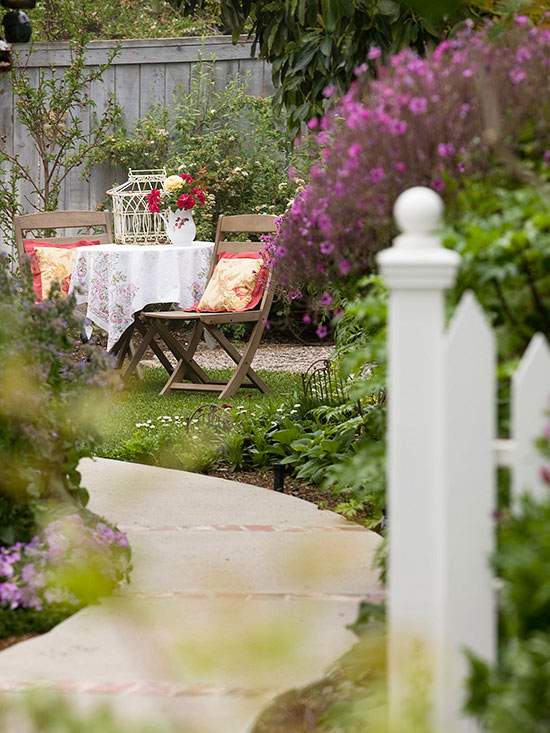 Jeśli masz w ogrodzie duże drzewa z gołymi, niezagospodarowanymi przestrzeniami pod nimi, wykorzystaj to miejsce dla stworzenia odkrytej przestrzeni życiowej. W tym małym ogrodzie, gdzie kilka rosnących drzew ogranicza założenie trawnika czy rabaty kwiatowej dodaj stół i krzesła.