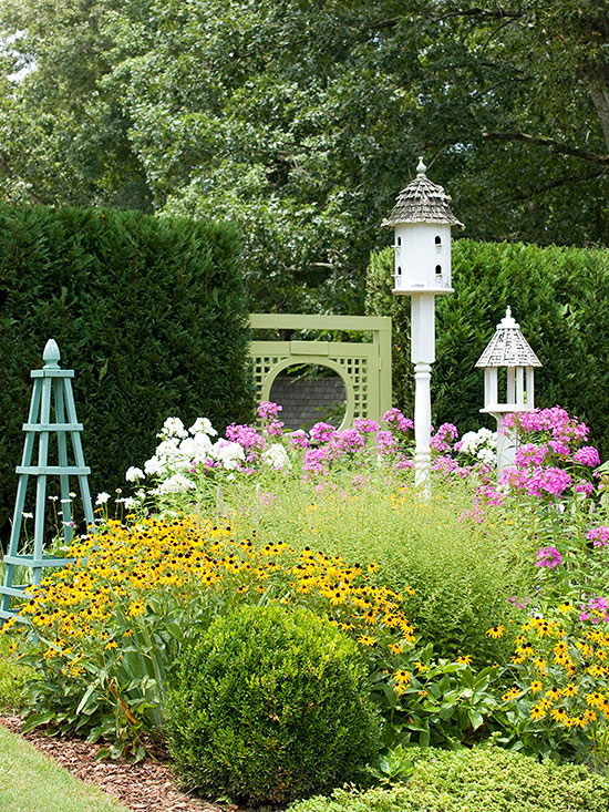 Nawet mały ogród może stać się rajem dla ptaków i motyli jeśli posadzimy rośliny, które lubią. Na przykład, ta część ogrodu jest pełna ptaków i motyli, które lubią rudbekie i floksy. Dokarmianie ptaków i wspaniałe budki dla nich dodają funkcję przyjaznej, dzikiej części ogrodu.