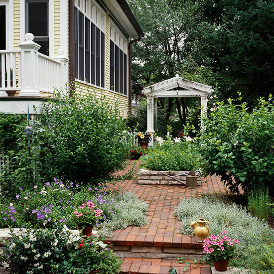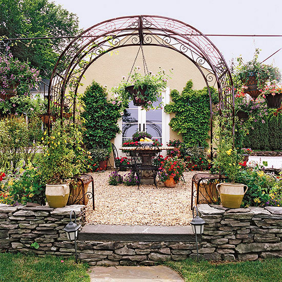 Stwórz swój własny zakątek raju sadząc swój mały ogródek w donicach i pojemnikach, przepełnionych kwiatami i pachnącymi ziołami. Na tym luksusowym podwórku, doniczki z pelargoniami oraz margerytkami zapewniają duże ilości koloru otaczającego ławeczkę. Duża terakotowa misa niczym niewielki basen z błyszczącą taflą wody jest także miejscem kąpieli dla ptactwa.