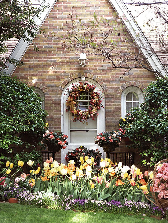 Planując swój ogród, warto myśleć o tym, jak on będzie wyglądać we wszystkich czterech porach roku. Wiele ogrodów wygląda wspaniale wiosną i wczesnym latem, ale w późniejszej jesieni czy zimie zaczynają zanikać. Wybierz byliny i rośliny jednoroczne, które oferują kolor także w późniejszej porze roku, a także krzewy i drzewa, które noszą kolorowe jagody lub mają interesującą korę w zimie. W tej części przed wejściem liczne tulipany zapewniają mnóstwo kolorów wiosną. Po ich zniknięciu są one zastępowane letnimi pięknościami takimi jak pelargonie i werbeny. Krzewy ostrokrzewu, które obramowują drzwi frontowe, rozwijają efektowne czerwone jagody, które dobrze wyglądają nawet w mrozy.