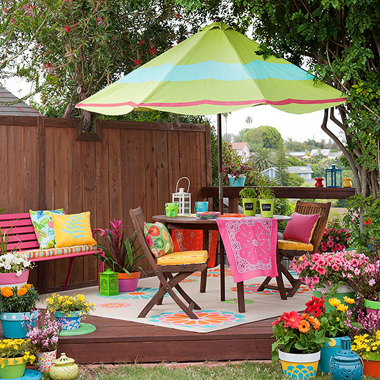 Cień na podwórkach jest doskonałym miejscem na spędzenie gorącego letniego popołudnia, ale zbyt często, mogą być trochę ciemne i ponure. Warto rozjaśnić widok kolorowymi poduszkami, tkaninami oraz dywanem, a także naczyniami w różnych kolorach i wzorach. To zacienione miejsce jest teraz bardzo kolorowe i zachęcające do rodzinnej zabawy.