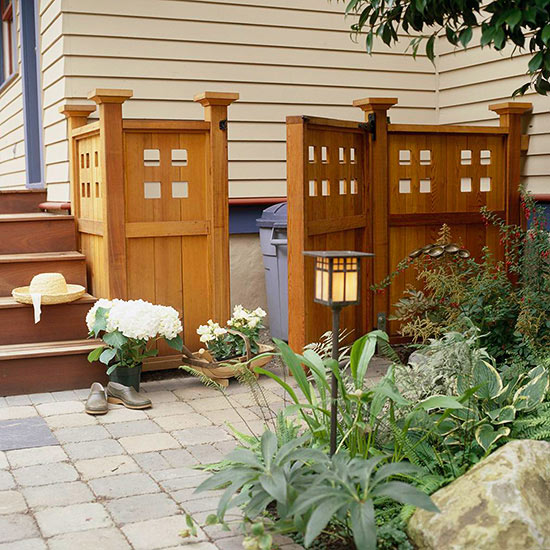 Nic szybciej nie psuje widoku na małym podwórku niż zestaw pojemników na śmieci, w dodatku przewróconych przez wiatr. Zamiast trzymać swoje śmieci na widoku, zbuduj drewniane obramowanie, aby utrzymać zawartość w porządku. Oto, zestaw stylowych drewnianych paneli doskonale maskuje śmieci właścicieli na małej przestrzeni. Gdy bramka jest zamknięta, wszystko jest całkowicie ukryte.