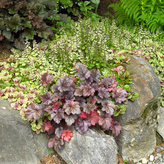 Należy zwrócić uwagę na teksturę liści, a także rozmaite barwy. Oto, na przykład, fioletowa Żurawka sprawia piękny kontrast wobec Dąbrówki rozłogowej 'Burgundy Glow' i szaro-niebieskich kamieni.