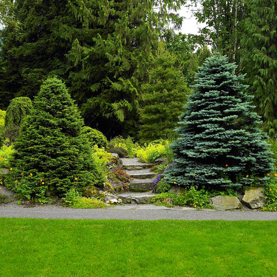 Dwa świerki gotowe, aby wprowadzić gości do ogrodu, na wzgórzu z wolno rosnącymi drzewami iglastymi i roślinami alpejskimi. Zimozielone drzewa są po prostu wystarczająco duże - około 2,5 m wysokości i 1,5 m szerokości - do gry w ukrycie krętej ścieżki, która prowadzi do porośniętego roślinnością ogrodu. "Definiowane wejście robi duże wrażenie", Brian mówi: "Witajcie!".
