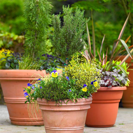 Zioła posadzone w skrzynkach okiennych i pojemnikach, dzięki czemu można umieścić je przed drzwiami do kuchni lub przy grillu. Można wtedy łatwo uciąć i zastosować do sałatek, zup, sosów. Poza tym to uczta dla oczu, jak również kubków smakowych.