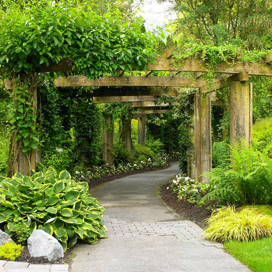 Sekret wprowadzenia intrygi w ogrodzie? "Zawsze mam krzywą", mówi Brian. "Aby zachować zagadkowość - Co odnajdę, co odkryję? Nie potrzeba dużo miejsca, aby to osiągnąć". Spacer na drugi koniec tej winorośli opartej na pergoli zastąpi długi spacer w wielkim ogrodzie czy parku.