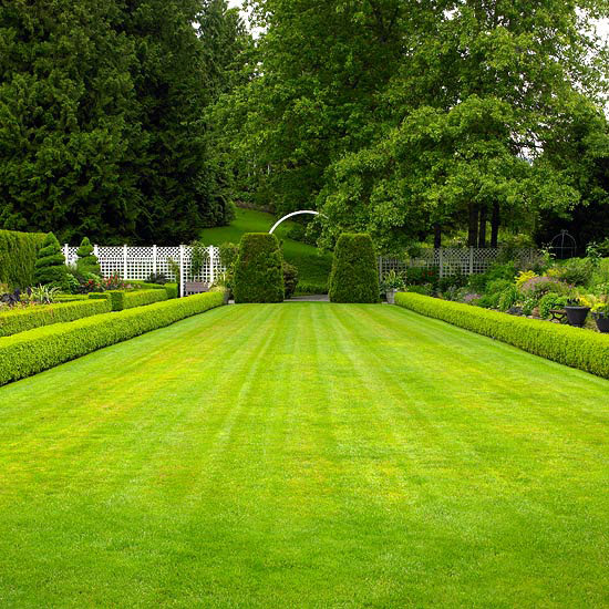 Brian tworzy iluzję dużej przestrzeni przez jej zwężenie. (trawnik) "W ogrodzie jest węższy o 8 stóp (ok. 2,40 m) na końcu, niż jest na pierwszym planie, w którym mierzy 20 stóp (ok. 6 m) od bukszpanu do bukszpanu," mówi Brian. Rezultat: przestrzeń, którą obserwujemy wydaje się półtora raza większa niż jest jej rzeczywista długość.
