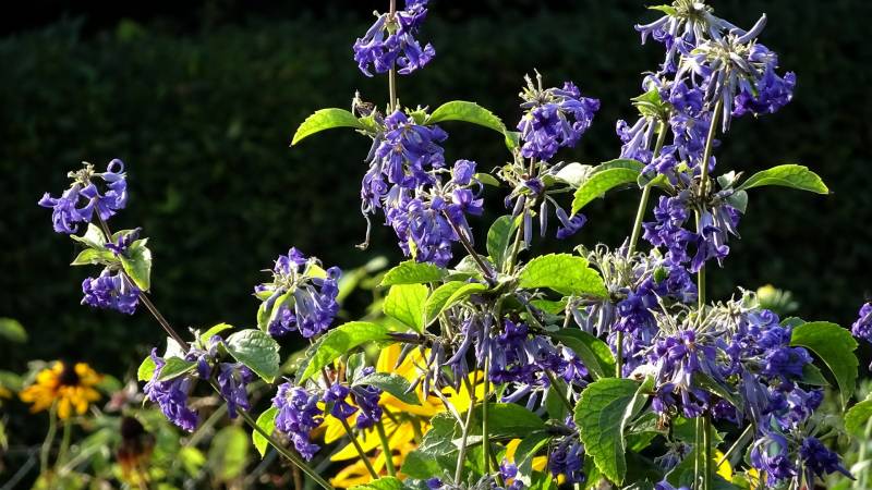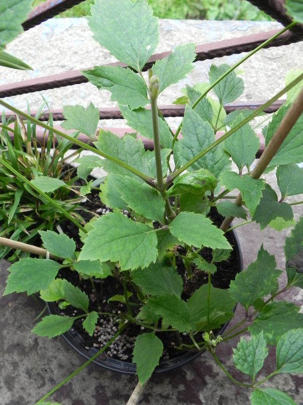 ), zatem niczym niezabezpieczona doniczka (nieduża, plastikowa) została na zewnątrz. Na wiosnę okazało się, że roślina dzielnie przetrwała trudy i zaniedbanie i pomimo to odbiła mocnymi pędami, oprócz tego mocno się rozkrzewiła więc czym prędzej dostała większą donicę. I teraz tak, rośnie bardzo silnie, w górę na ponad metr, ale i podobnie na szerokość, pędy są mocne, sztywne, nie wymagające podpór. U mnie stoi obecnie na szczycie pagórka przed domem, ma więc słońce prawie cały dzień. Nie przeszkadzają mu silne ostatnio wiatry, ani kotłujące się obok jego donicy psy. Sporo pije, ale nie jest nadwrażliwy na brak, kiedy ma za sucho widać po liściach, tracą wigor, ale szybko się zbierają po podlaniu. Generalnie polecam jako zupełnie niekłopotliwą, a robiącą wrażenie bylinę, Szybko zrobi efekt, zarezerwujcie mu jednak sporo miejsca. Kwiaty są nieduże, ale dość liczne, teraz zaczyna kwitnienie.
