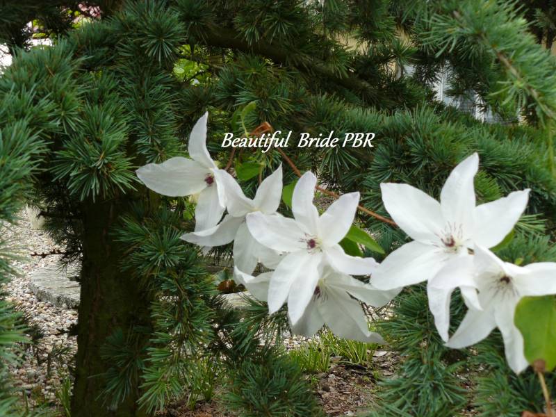 Kwiaty: z purpurowymi pręcikami, ładnie kontrastującymi z bielą płatków, ogromne do 28 cm średnicy. Kwitnie bardzo obficie V-VII, powtarza słabo w sierpniu.