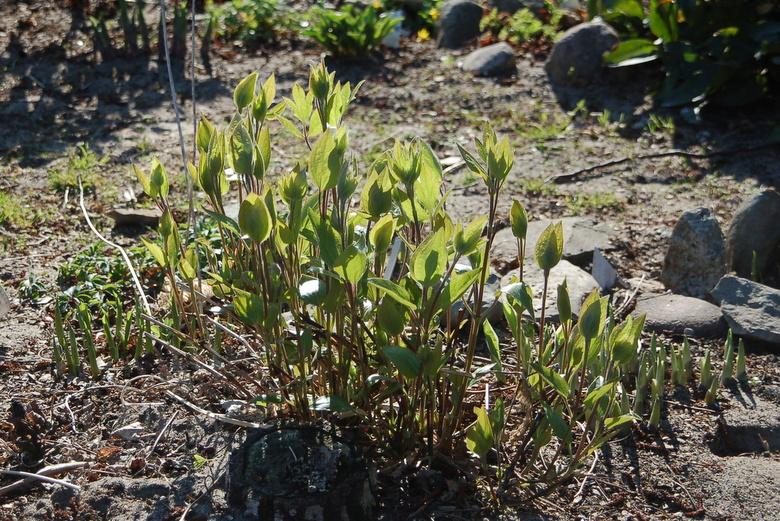 Powojnik Sizaia Ptitsa został przeze mnie przycięty w marcu na wysokość około 15 cm i niemal natychmiast zaczął rozwijać pąki. Oparł się niedawnym przymrozkom, nawet jeden listek nie jest uszkodzony.