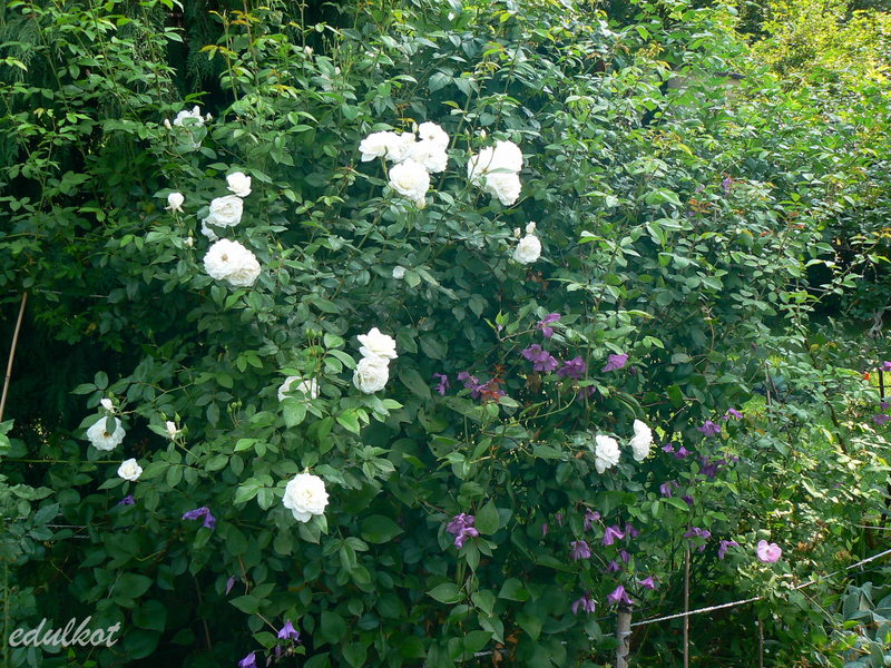 Rośnie pomiędzy wielkimi pnącymi różami, pomiędzy Rosarium Uetersen i Icebrg Cl. Z drugiej strony Iceberg Cl. rośnie Pamiat Serdtsa, ale ten radzi sobie ciągle dobrze.