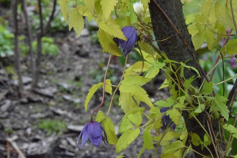 Koleżanka, bardzo sobie chwaliła ten powojnik, dlatego i ja postanowiłam zaprosić go do swojego ogrodu. Posadziłam przy czerwonolistnej wiśni, żeby uzyskać kontrast barwny. Przyjechał z pączkami kwiatowymi na początku maja i szybko je otworzył: