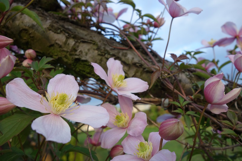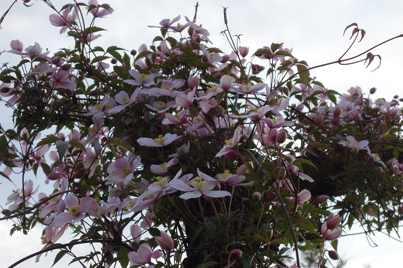 Powojnik montana Rubens po przemarznięciu w zimie 2020/2021 odbudowywał się od ziemi i teraz zakwitł.
