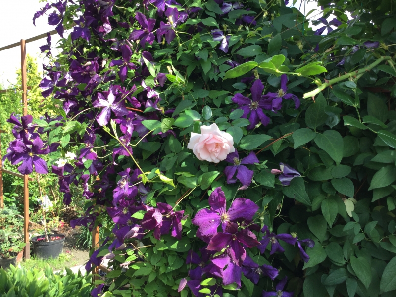 W tym sezonie trochę nie upilnowaliśmy róży New Dawn i znacząco zajęła miejsce powojnikom Polish Spirit,między którymi rośnie krecigl .