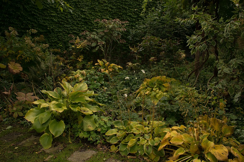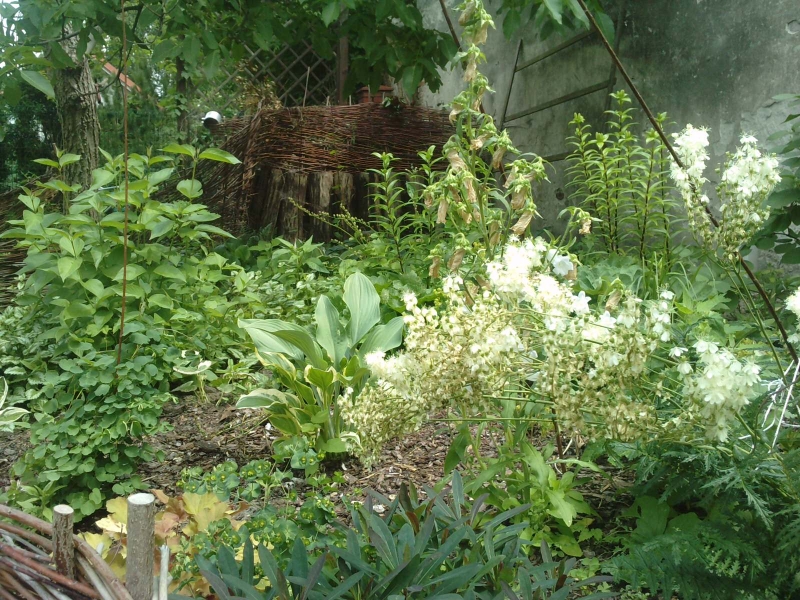 krzewy i choć to nie byliny, to wymienię je także: parzydło leśne, hortensja bukietowa(wiechowata) Unique, hortensja omszona (kosmata) Macrophylla, hortensja dębolistna, kalina hordowina i sztywnolistna. Była jeszcze kalina bodnańska "Dawn", ale warunki jej nie odpowiadały i wyjechała na wieś. Krzewy są podsadzone czosnkiem niedźwiedzim, który świetnie tam rośnie i mnoży się.