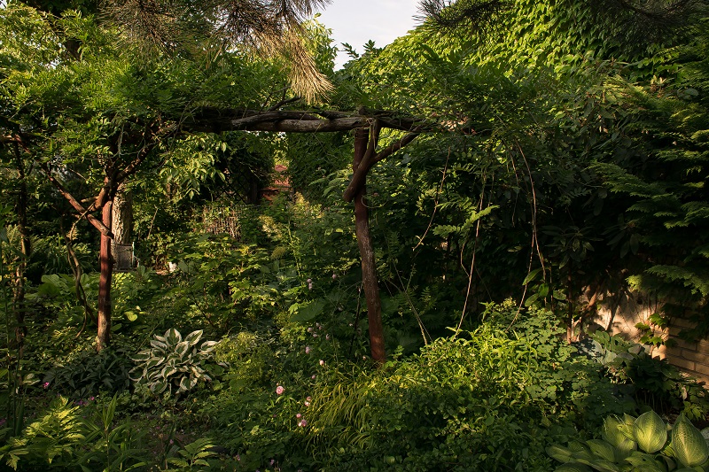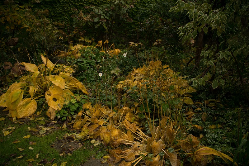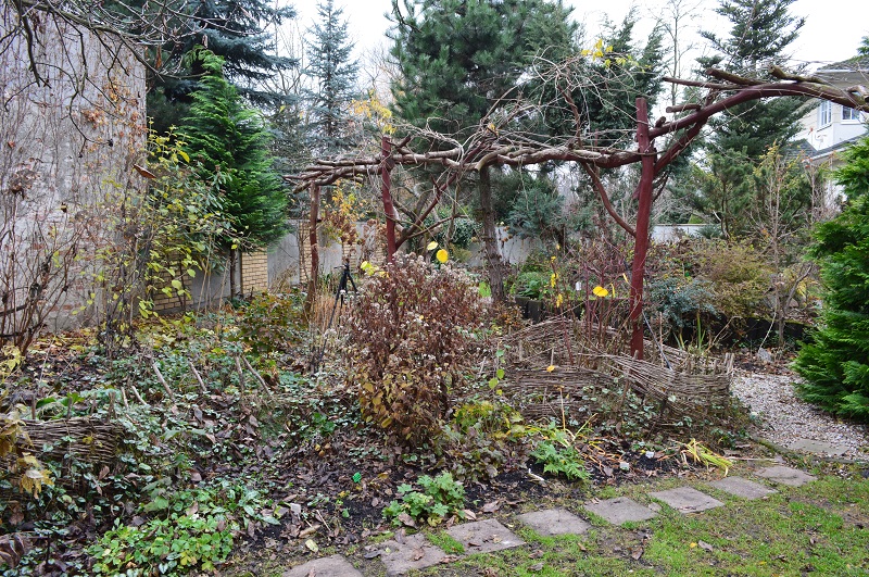 pod okapem orzecha włoskiego, który nie jest uważany za dobre sąsiedztwo dla bylin, choć ja nie odnotowuję jakichś problemów związanych z substancjami zawartymi w liściach. Korona drzewa została prześwietlona i skorygowana tak, aby poprawić statykę.