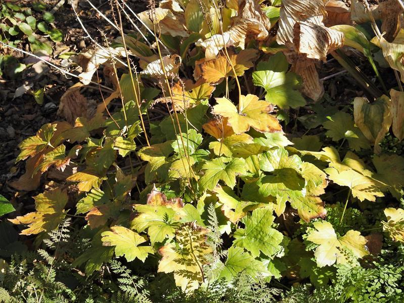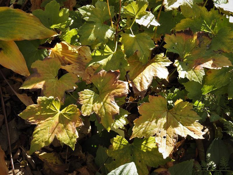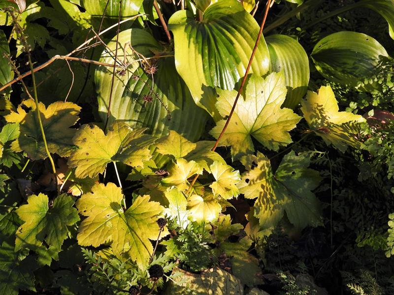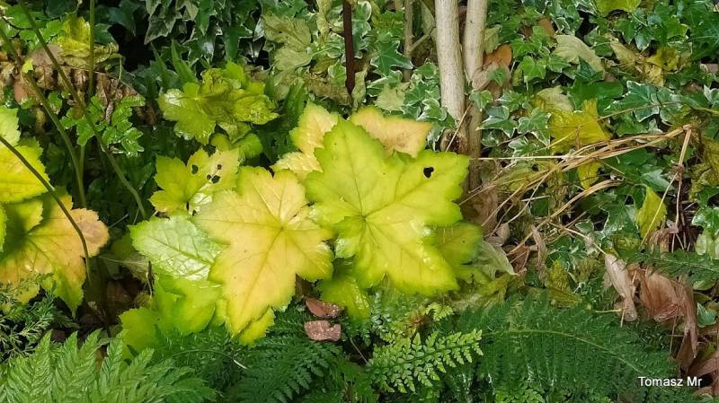 Świecznica japońska 'Cheju-do' wciąż dekoracyjna, choć teraz już tylko z przebarwiających się na żółto jesienią liści.