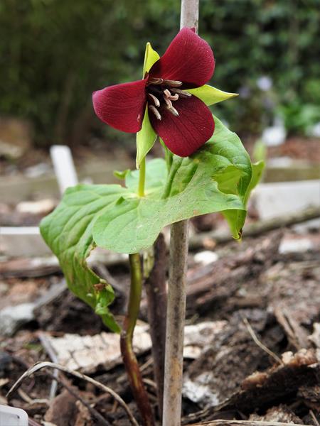 Zakwitł mój zeszłoroczny zakup Trillium erectum hu_rra Malutek jeszcze, więc patyczek dostał, bo się chwiał na tej chudej nóżce.