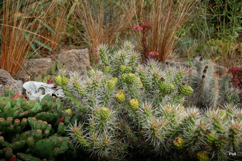 Pięknie skomponowane suche rabaty w Szkółce Grochowscy w Radkowie... Wśród roślin wielkie, zdrowo rozrośnięte kępy różnych opuncji , które nigdy - według słów właściciela - nie były przykrywane. Zdjęcia były robione 04.09.2016r, więc zamiast kwiatów, widzimy zawiązane owoce.